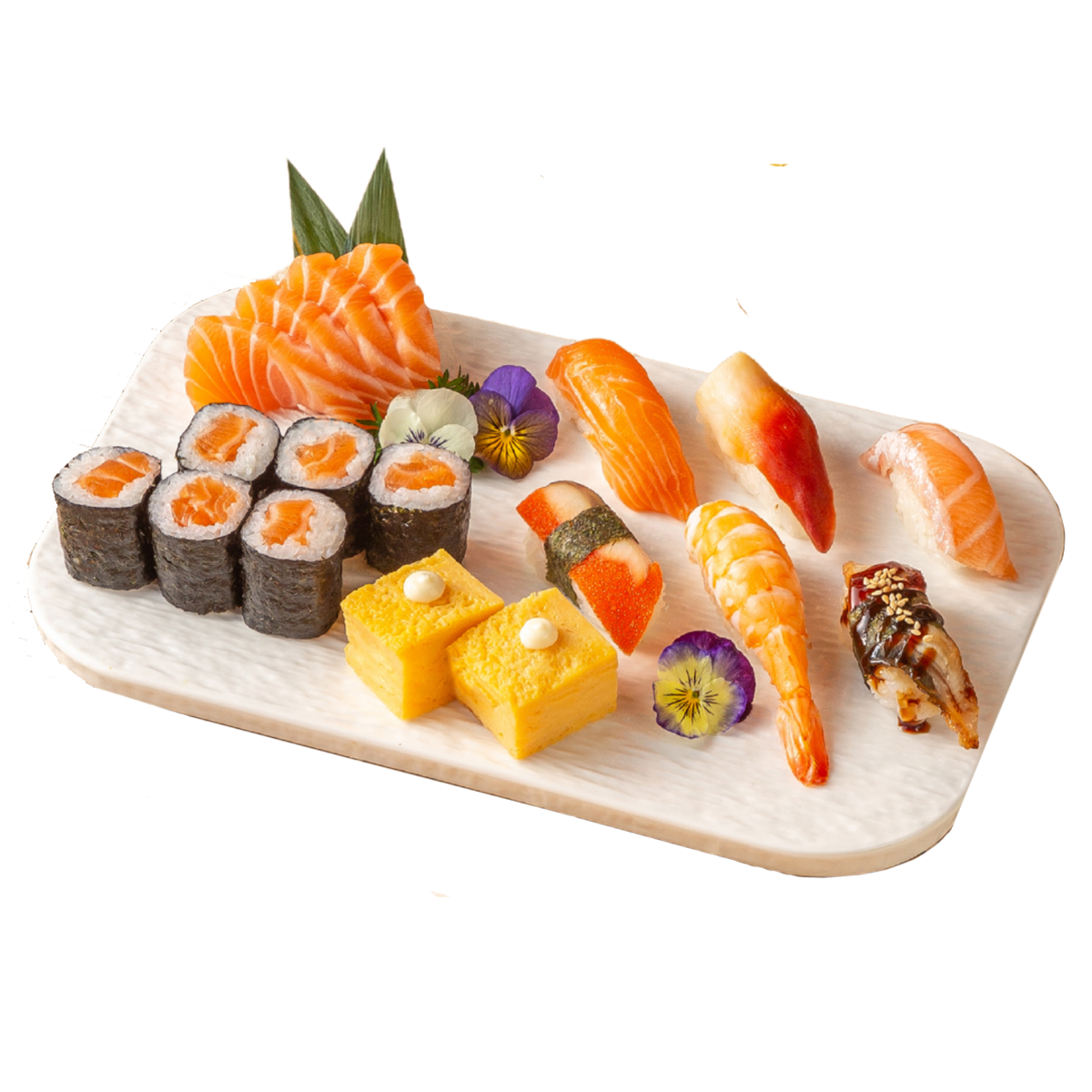 Sashimi cá Hồi, Sushi cá Hồi, Nigiri cá Hồi, Nigiri cá Trích, Nigiri Lươn, Nigiri sò Đỏ, Nigiri Tôm, Trứng cuộn