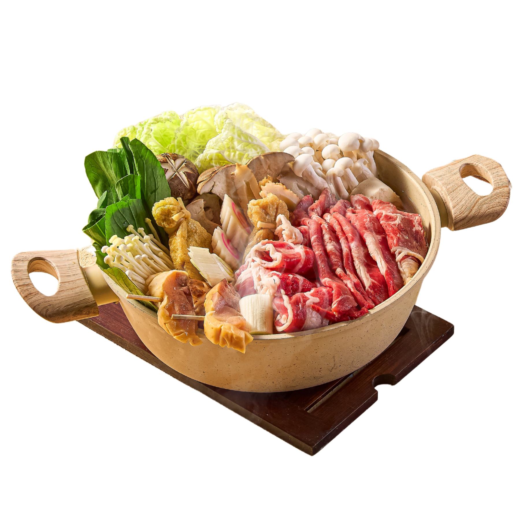 Nhân lẩu bao gồm: lõi vai bò Mỹ, ba chỉ bò Mỹ, xiên gà, chả cá Naruto, chả cá Chikuwa, đậu hũ túi tiền Mochi, nấm rươi và rau