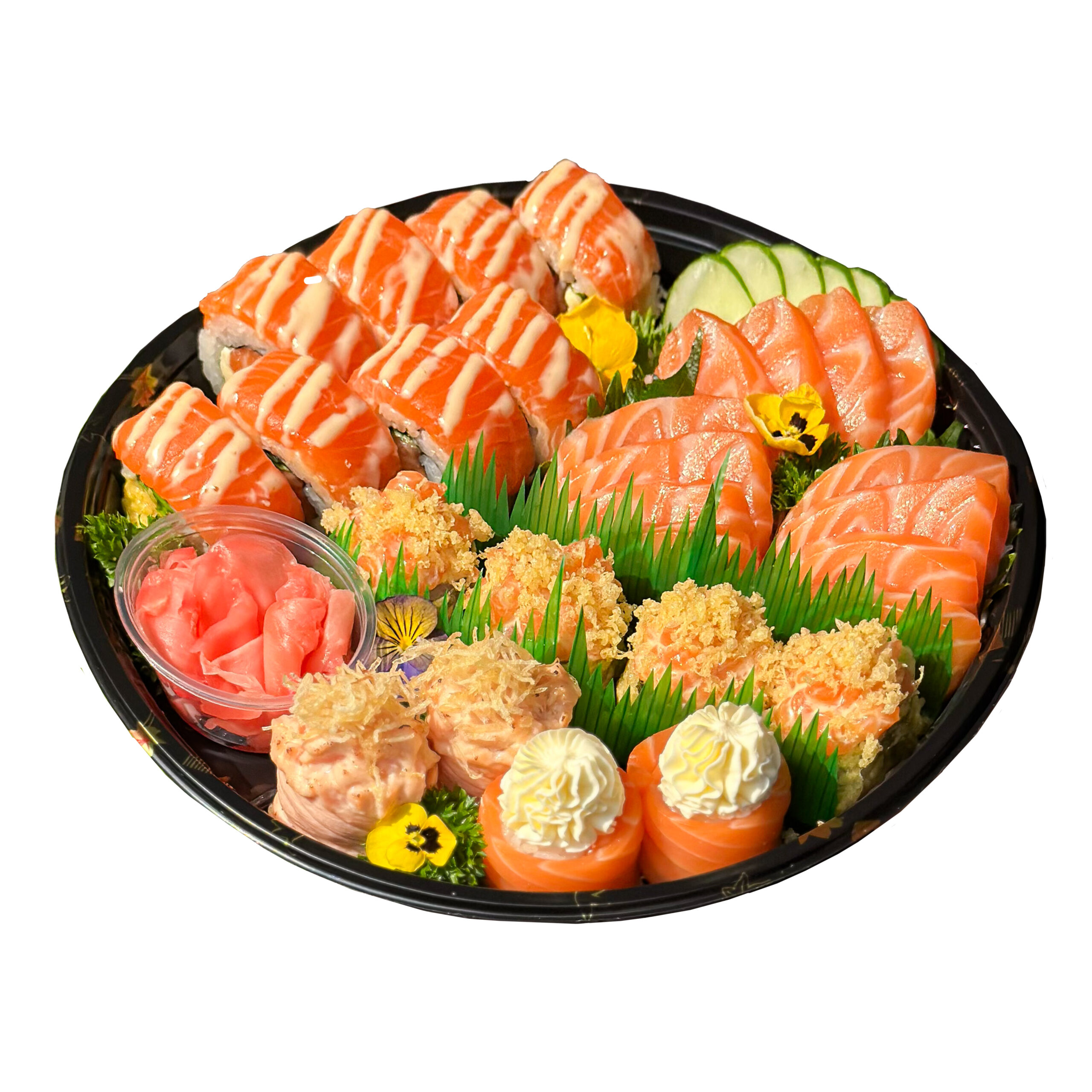 Phù hợp cho 2 người ăn. Bao gồm: Sashimi cá hồi, Trứng cá hồi, California cá hồi phủ cá hồi